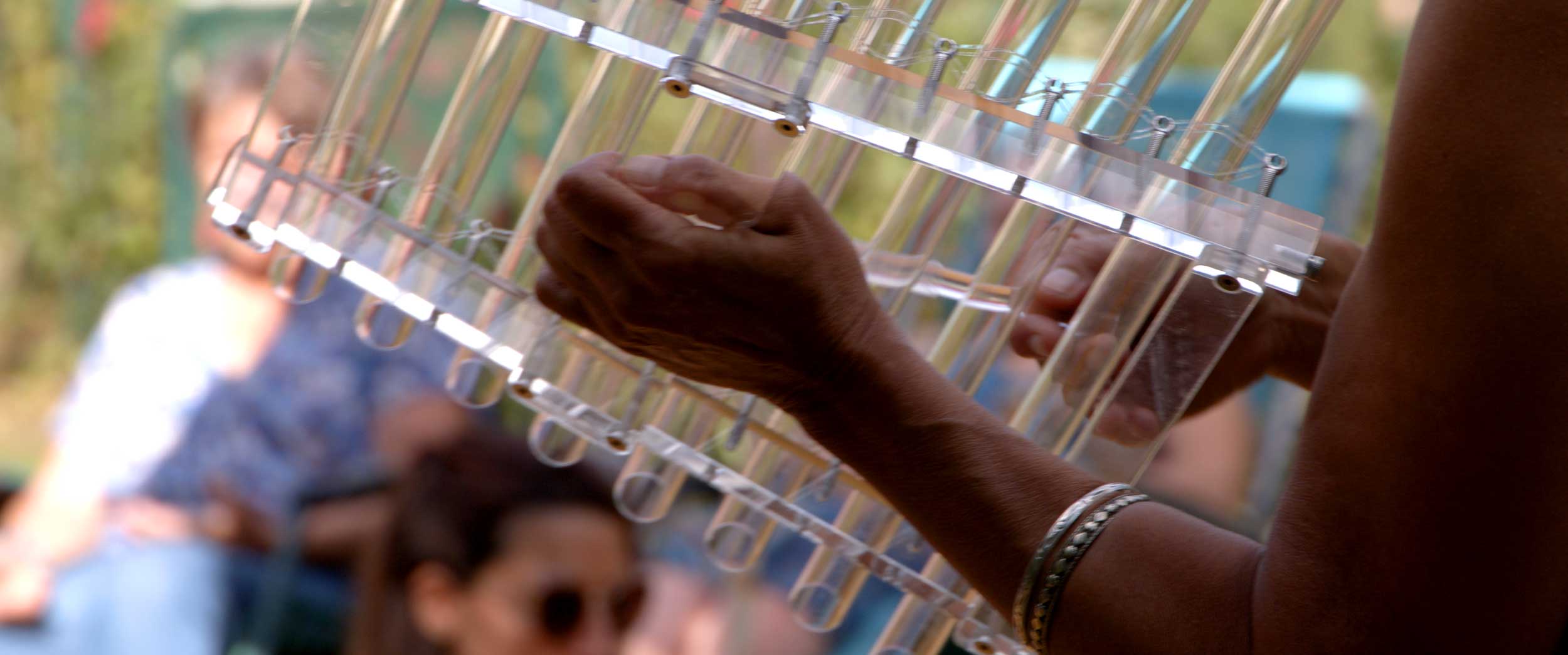 tambour, maracas, crécelles, bols, gong, carillons, tubalophone, harpe de cristal, kigonki.